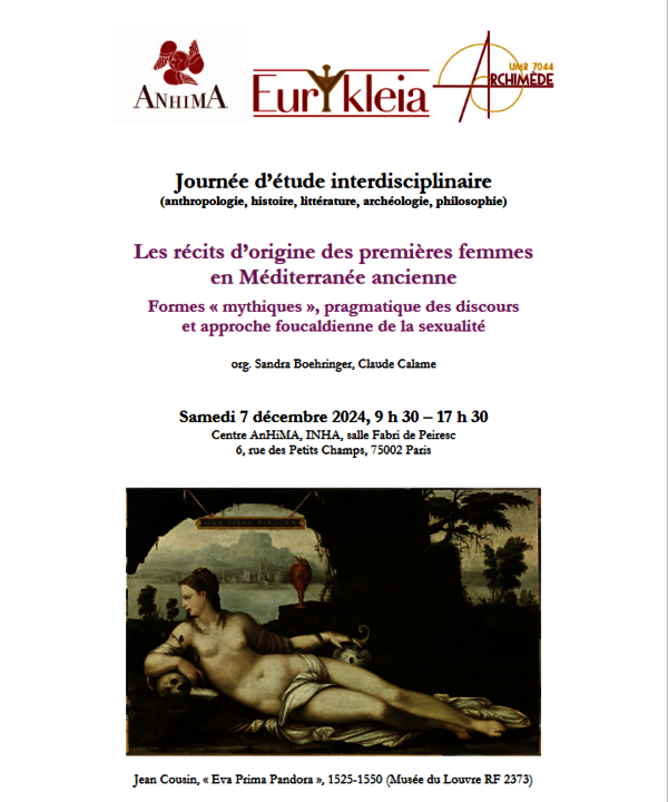 Journée d’étude interdisciplinaire : « Les récits d’origine des premières femmes en Méditerranée ancienne. Formes ‘mythiques', pragmatique des discours et approche foucaldienne de la sexualité », le samedi 7 décembre 2024 (Centre AnHiMA, INHA, salle Fabri de Peiresc, Paris), organisée par Sandra…