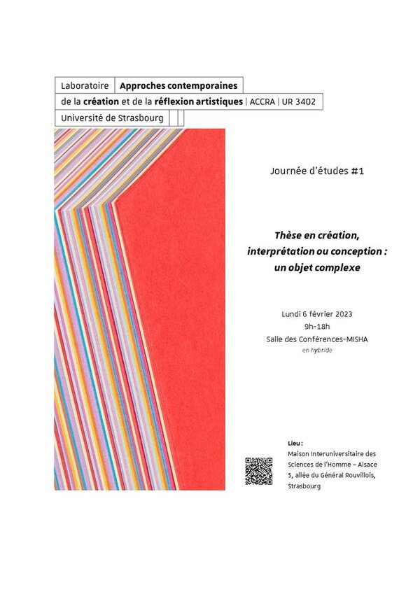 Journée organisée par Maxime FAVARD, Grazia GIACCO et Stéphane MROCZKOWSKI, dans le cadre du groupe de travail « Recherche-création et méthodologies didactiques dans les arts et la technologie », avec le soutien de l'ACCRA. Cette journée est la première d'un cycle dont le sujet porte sur la « thèse…
