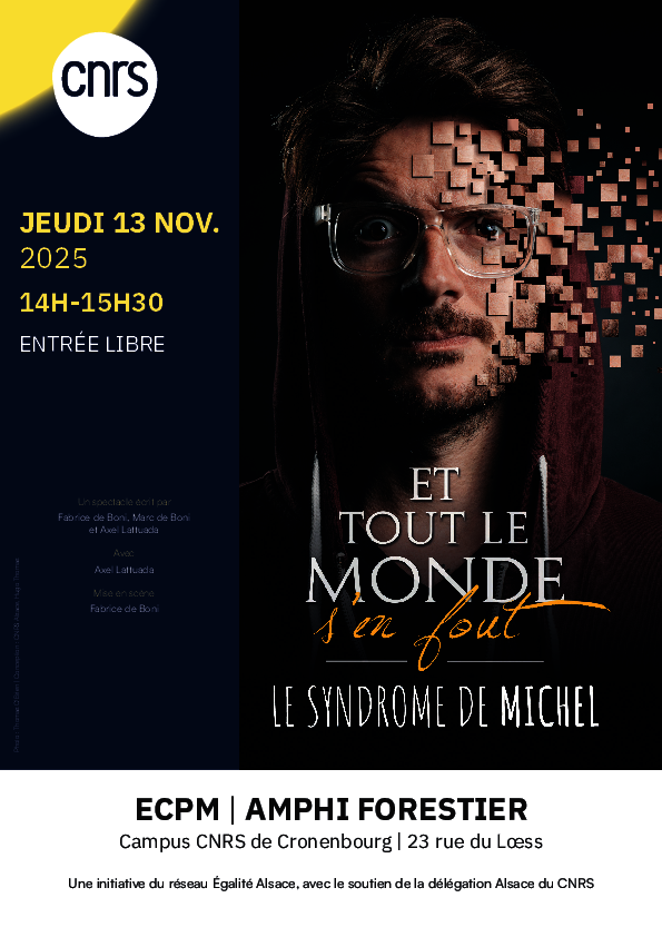 Ce spectacle s’inscrit en clôture du projet « Former et informer sur l’égalité pour créer des conditions de travail favorables à la recherche » déployé sur le campus CNRS de Cronenbourg. Le projet a été financé par le programme de qualité de vie et des conditions de travail (QVCT) de la Direction des Ressources humaines. 150 personnes ont pu être formées et ce spectacle vous propose un temps de sensibilisation, sur un ton décalé, telle une formation en format accéléré.