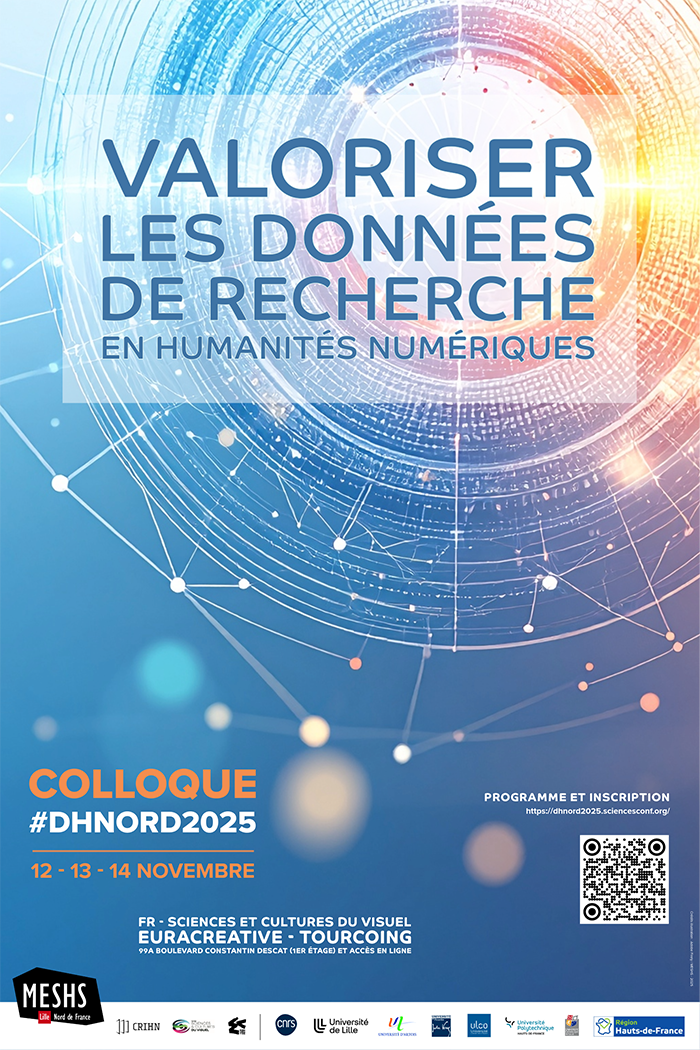 Depuis 2014, le colloque international DHNord propose un espace de réflexion sur les pratiques et évolutions des humanités numériques dans l’enseignement supérieur et la recherche, en incluant le monde des bibliothèques, des archives et des musées. Organisé par la Maison Européenne des Sciences de l’Homme et de la Société (MESHS), en partenariat avec le Centre de recherche interuniversitaire sur les humanités numériques (CRIHN), l’édition 2025 se déroulera les 12, 13 et 14 novembre à l'université de Lille (Fédération de Recherche - Sciences des Cultures et du Visuel) et en hybride via Zoom.