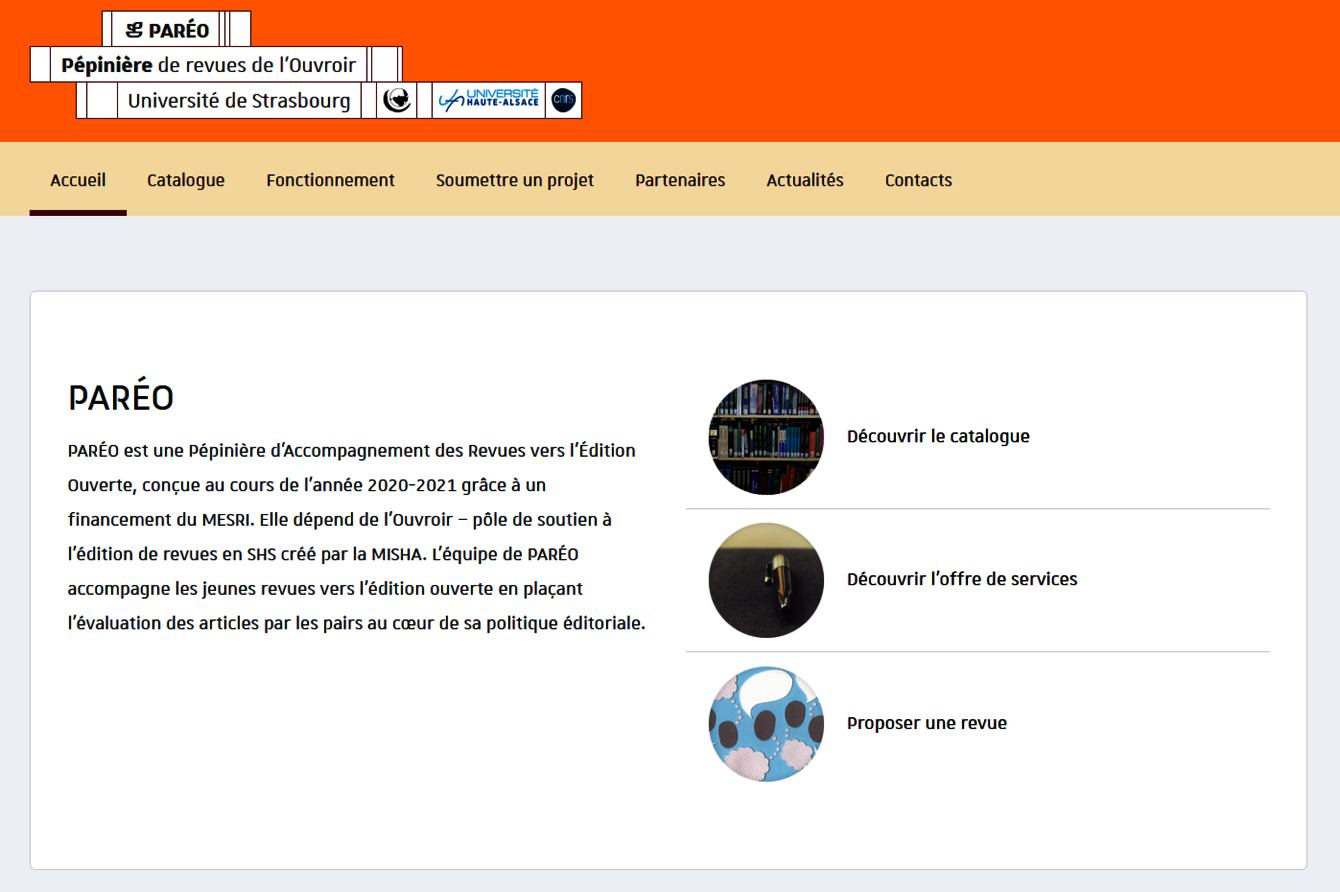 PARÉO est la Pépinière d’accompagnement des revues vers l’édition ouverte de la MISHA. Le portail héberge des revues scientifiques portées par des équipes éditoriales du site universitaire alsacien. Cet hébergement, gratuit, est temporaire, les équipes de revues s’engageant à candidater à OpenEdition Journals dès que les critères attendus par cette plateforme sont atteints.