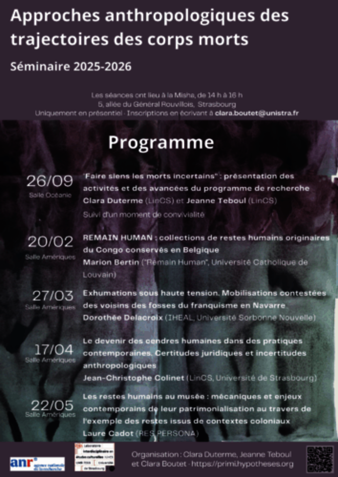 Le séminaire de recherche adossé au programme “Faire siens les morts incertains” (financé par l’ANR) a lieu le vendredi après-midi (14h-16h) à la Misha. 5 séances par an. Organisation : Jeanne Teboul et Clara Duterme.