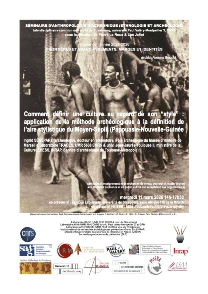 « Comment définir une culture au regard de son “style”. L’application de la méthode archéologique à la définition de l’aire stylistique du Moyen-Sepik (Papouasie-Nouvelle Guinée) », conférence d’Ingrid Sénépart (archéologue, docteur en préhistoire, Pôle archéologie du Musée d’Histoire de Marseille, membre du laboratoire TRACES, UMR 5608 CNRS & université Jean-Jaurès-Toulouse II, ministère de la Culture, EHESS, INRAP, Service d’archéologie de Toulouse-Métropole, présidente des Rencontres méridionales de préhistoire récente, présidente de la Société languedocienne de préhistoire)