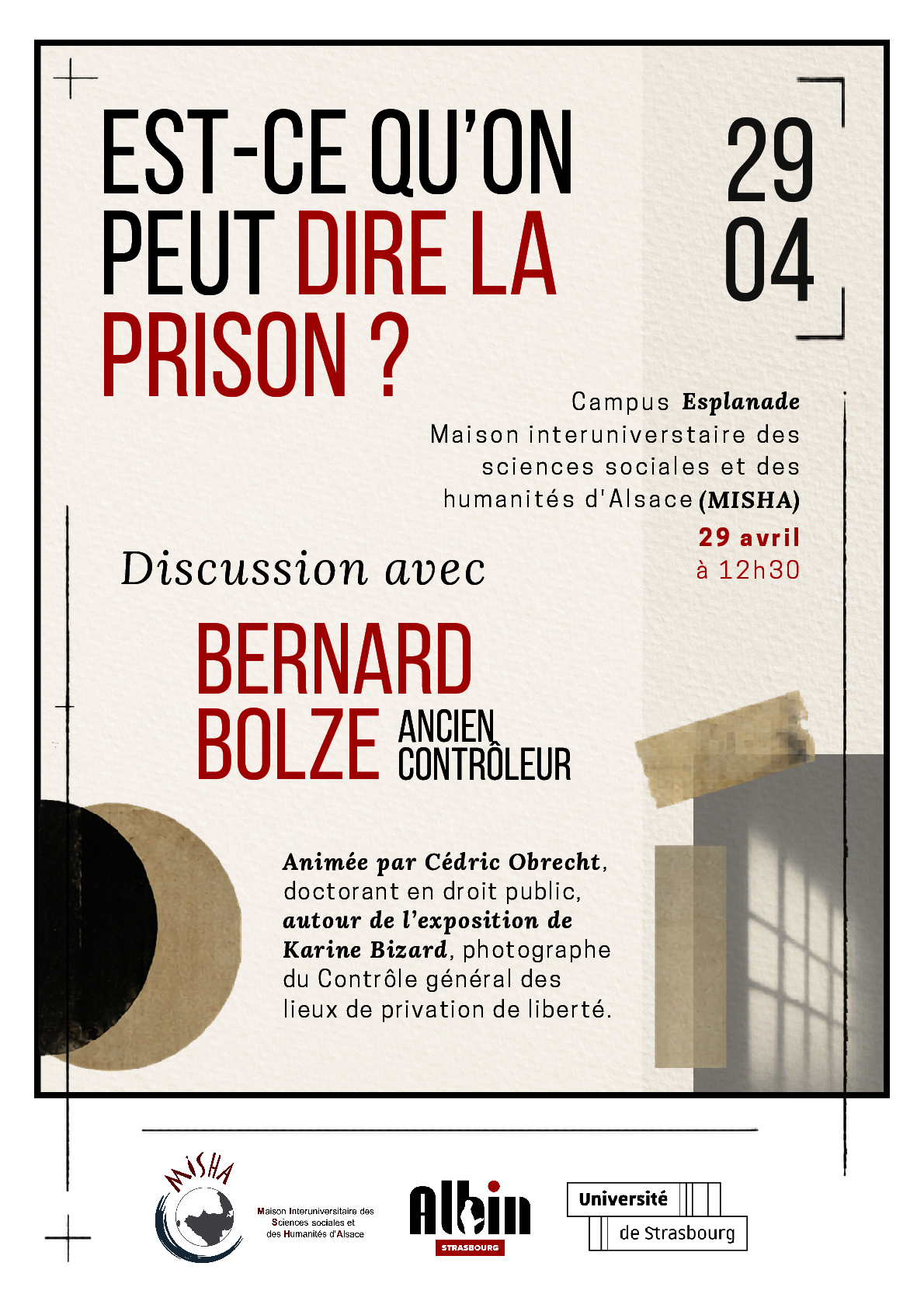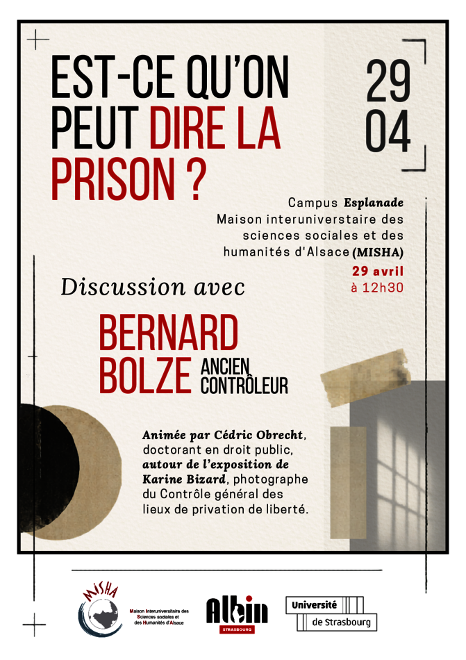 « Est-ce qu'on peut dire le silence, [...] est-ce qu'on peut dire l'attente, [...] est-ce qu'on peut dire la solitude ? » Ainsi Pierre Goldman, depuis sa cellule, égrenait en 1975 la litanie de ce qui, en prison, résiste aux mots. À cette question, Bernard Bolze a consacré sa vie. Fondateur de l'Observatoire international des prisons en 1990, ancien contrôleur du CGLPL, fondateur de Prison Insider, il a passé quarante ans à regarder et à faire regarder la prison. En dialogue avec Cédric Obrecht, doctorant en droit public, il revient sur ce que cet engagement lui a appris de ce que l'on peut dire de l'enfermement, à travers les mots et la photographie. La rencontre se déroule dans l'exposition « Travail en peine » de Karine Bizard, photographe du CGLPL.