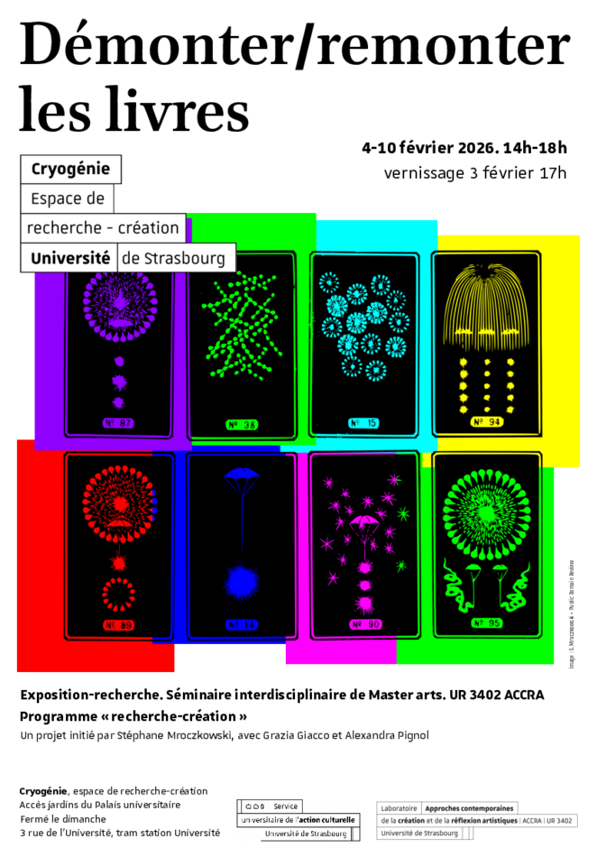 Exposition organisée par Stéphane MROCZKOWSKI, Grazia GIACCO et Alexandra PIGNOL, avec le soutien de l'ACCRA, de la Faculté des Arts (université de Strasbourg), du SUAC (université de Strasbourg) de la Cryogénie - Espace de recherche et création, de la bibliothèque des arts (Université de Strasbourg) et du dispositif de boîtes à livres de la ville de Strasbourg, et liée au séminaire interdisciplinaire de l'ACCRA « Exposer la recherche-création : livre, pages, objets et dispositifs participatifs » dans le cadre du programme de recherche « recherche-création ».