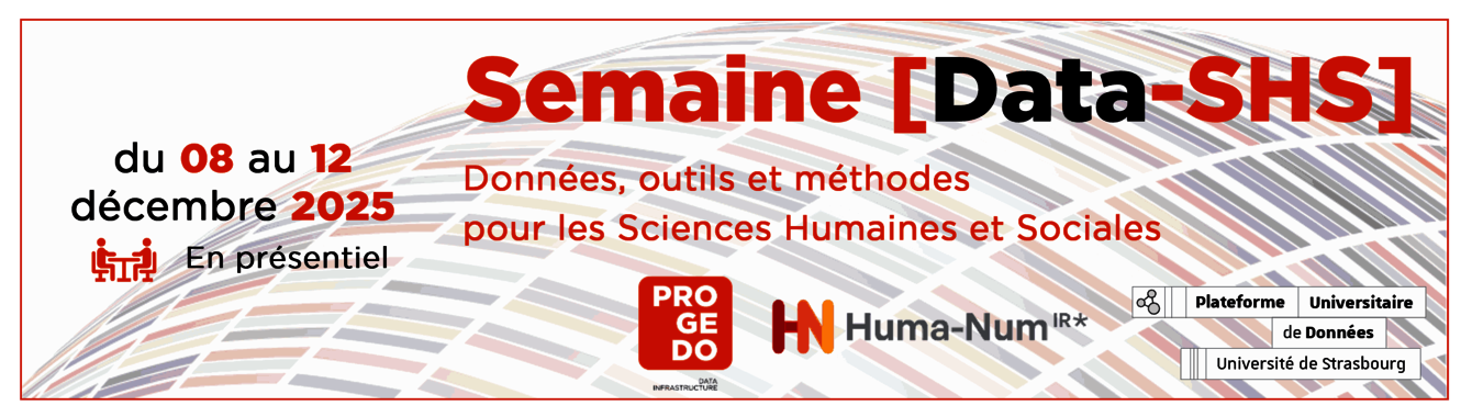 La Plateforme Universitaire des Données (PUD-S) a le plaisir de vous inviter à la 7e édition de la semaine [Data-SHS] qui se tiendra du lundi 8 décembre au vendredi 12 décembre 2025 à la Maison Interuniversitaire des Sciences sociales et des Humanités d'Alsace (MISHA).