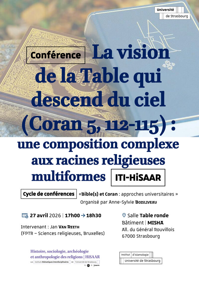Dans le cadre du cycle de conférences "Bible(s) et Coran : approches universitaires" organisée par Anne Sylvie Boisliveau avec l'Institut d’islamologie de l’université de Strasbourg et l'ITI Hisaar - Histoire, sociologie, archéologie et anthropologie des religions.