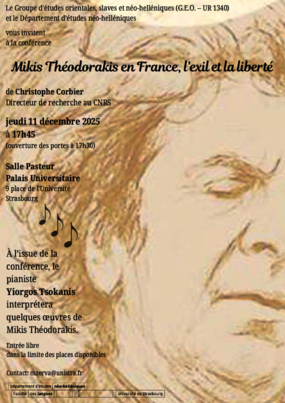 vous invitent à la conférence de Christophe Corbier, Directeur de recherche au CNRS, intitulée “Mikis Théodorakis en France, l'exil et la liberté”.