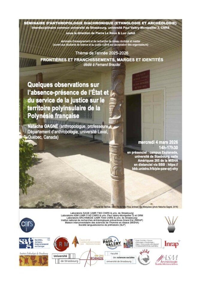 « Quelques observations sur l’absence-présence de l’État et du service de la justice sur le territoire polyinsulaire de la Polynésie française », conférence de Natacha Gagné (anthropologue, professeure, Département d’anthropologie, université Laval, Québec, Canada)